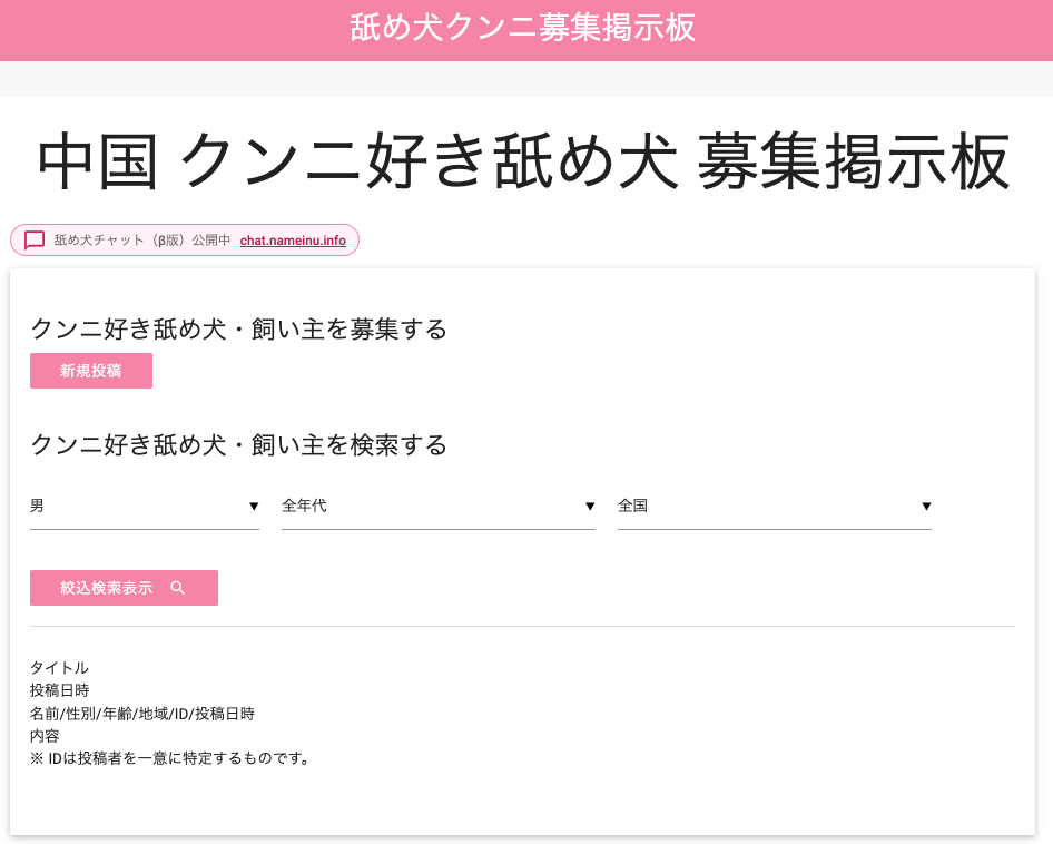 - 中国地方(舐め犬):https://bbs.nameinu.info/list?sex=man&age=all®ion=tyugoku