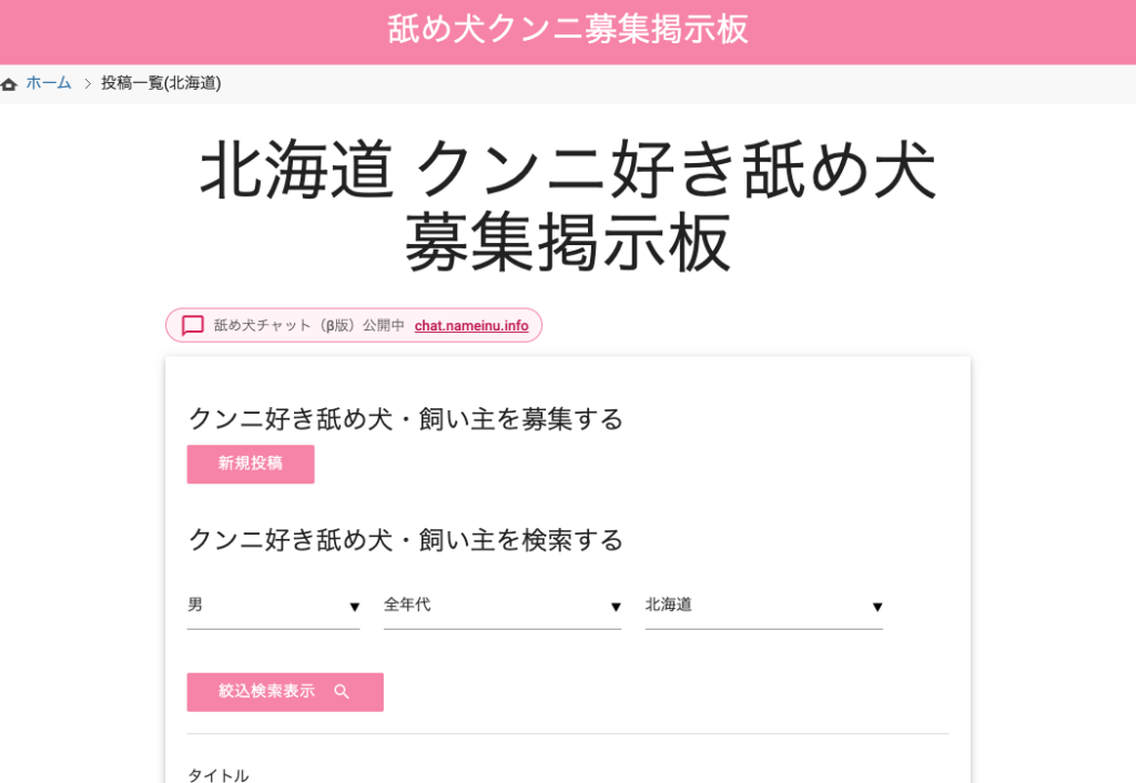 北海道の舐め犬(男性)の投稿はこちら:https://bbs.nameinu.info/list?sex=man&age=all®ion=hokkaido