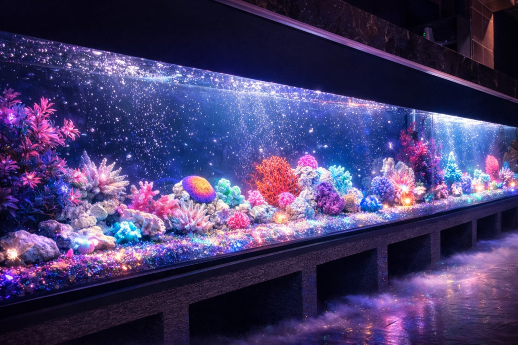 珊瑚のコンセプトは「大人の隠れ家」。落ち着いた照明と音楽が流れる店内に、水槽の魚がゆったりと泳ぐ、リラックスできる空間です。2026年1月末からはこたつスペースも導入され、よりくつろいだ雰囲気で過ごせるようになっています。